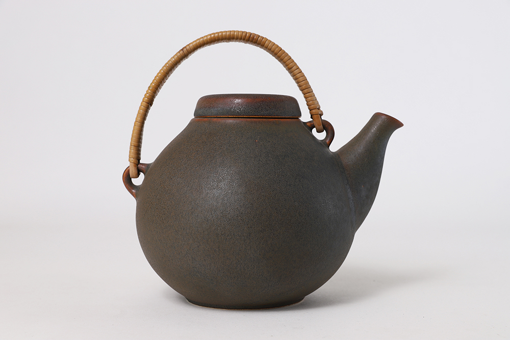 丸みの帯びた無駄のないフォルムに、藤のハンドルが配されたシンプルなデザインですが、日本人にとって「懐かしさ」が感じられる質感が魅力的な一品です。それは日本の急須に通ずるものがあるからだと思います。
