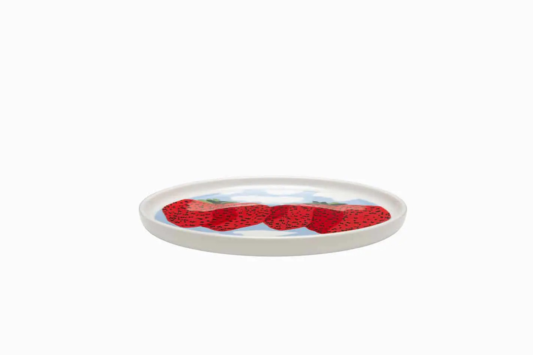1960年代に発表されたパターン「マンシッカ」(イチゴ)。大きなイチゴが配されているこのパターンには、「マウンテン」という追加名が付けられています。青い空に反対色の赤いイチゴが浮かぶ大胆なデザインは、いかにもマイヤ・イソラらしい作風です。こちらは2023年春に復刻されました。