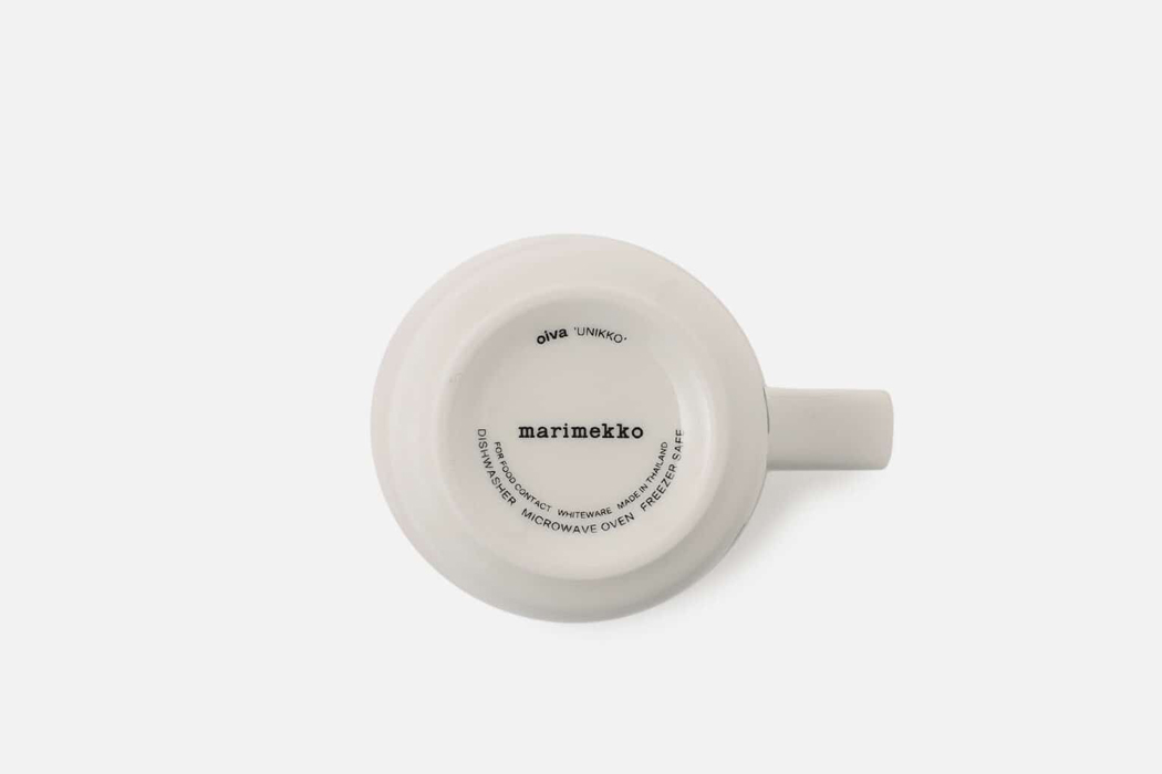 フォルムデザインはOIVAに代表されるフィンランド著名デザイナー:サミ・ルオツァライネン氏によるものです。最近のマリメッコテーブルウェアは、彼のフォルムデザインが大半を占めます。美しく無駄のないフォルム、実際に使用した時の使いやすさ、電子レンジ使用ができる等デザインと利便性を高い次元で有しています。