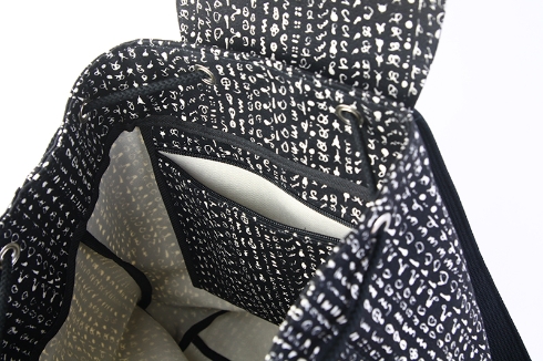 素材はコットンキャンバスを使用しています。本体はマチ幅があるため、紐を広げると大きな開口部になります。容量も大きく大体15Lぐらいです。インナーポケット付きなので、お財布入れや、定期券入れなどのスペースとしてお使いいただけると思います。